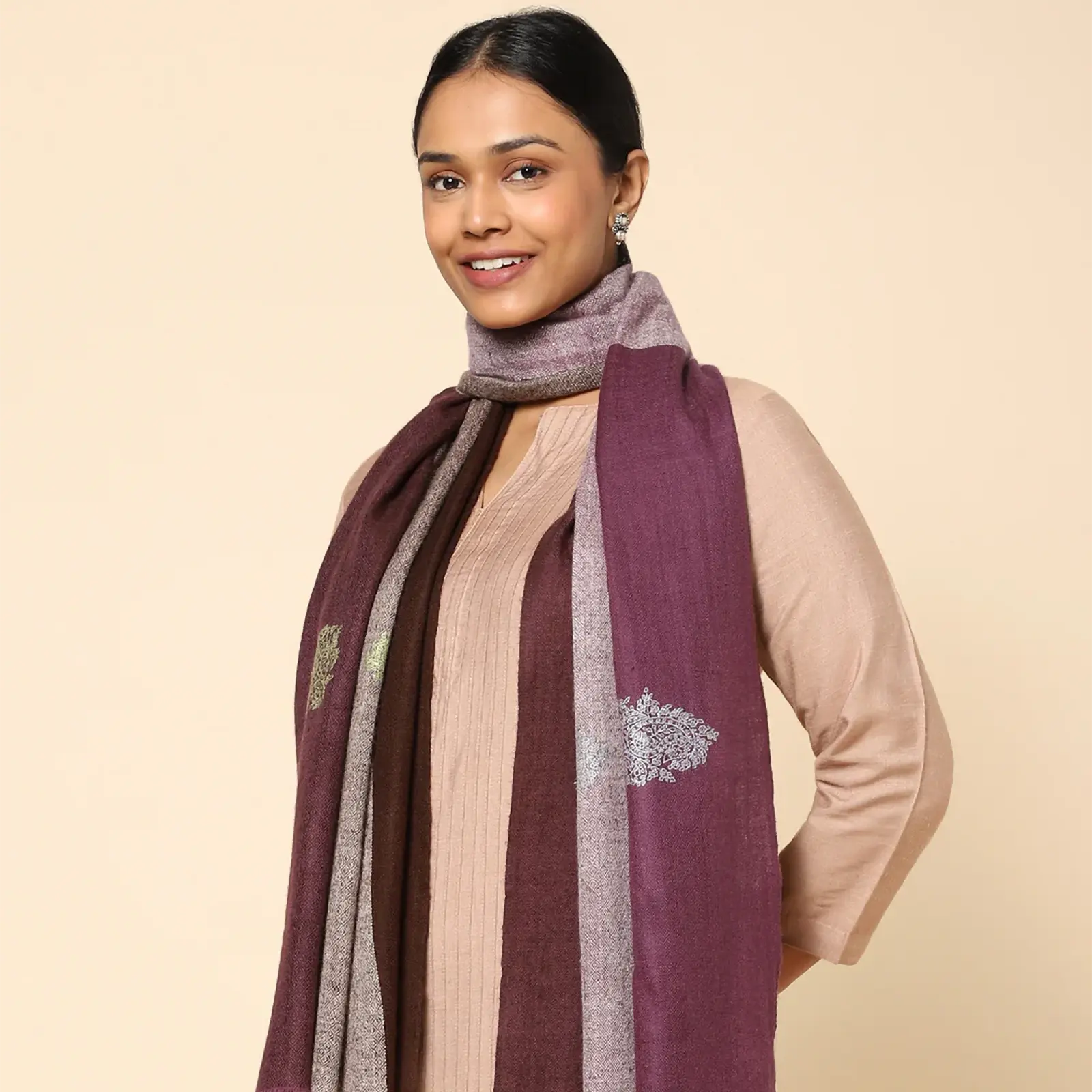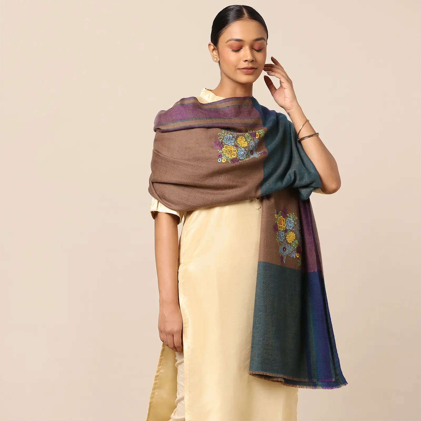 Sozni embroidery, a delicate art from Kashmir, features satin stitch motifs on Pashmina shawls. Designers create patterns and wood carvers make blocks to trace the design on the fabric and artisans meticulously embroider each motif. This timeless fusion of artistry and craftsmanship takes 3-5 months.